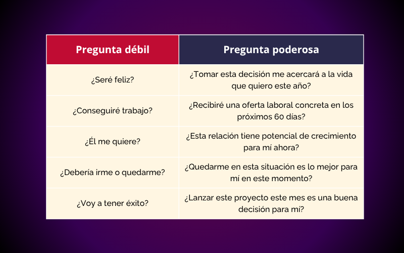 • Preguntas demasiado abiertas: “¿Seré feliz?” No hay un marco temporal ni un contexto específico.